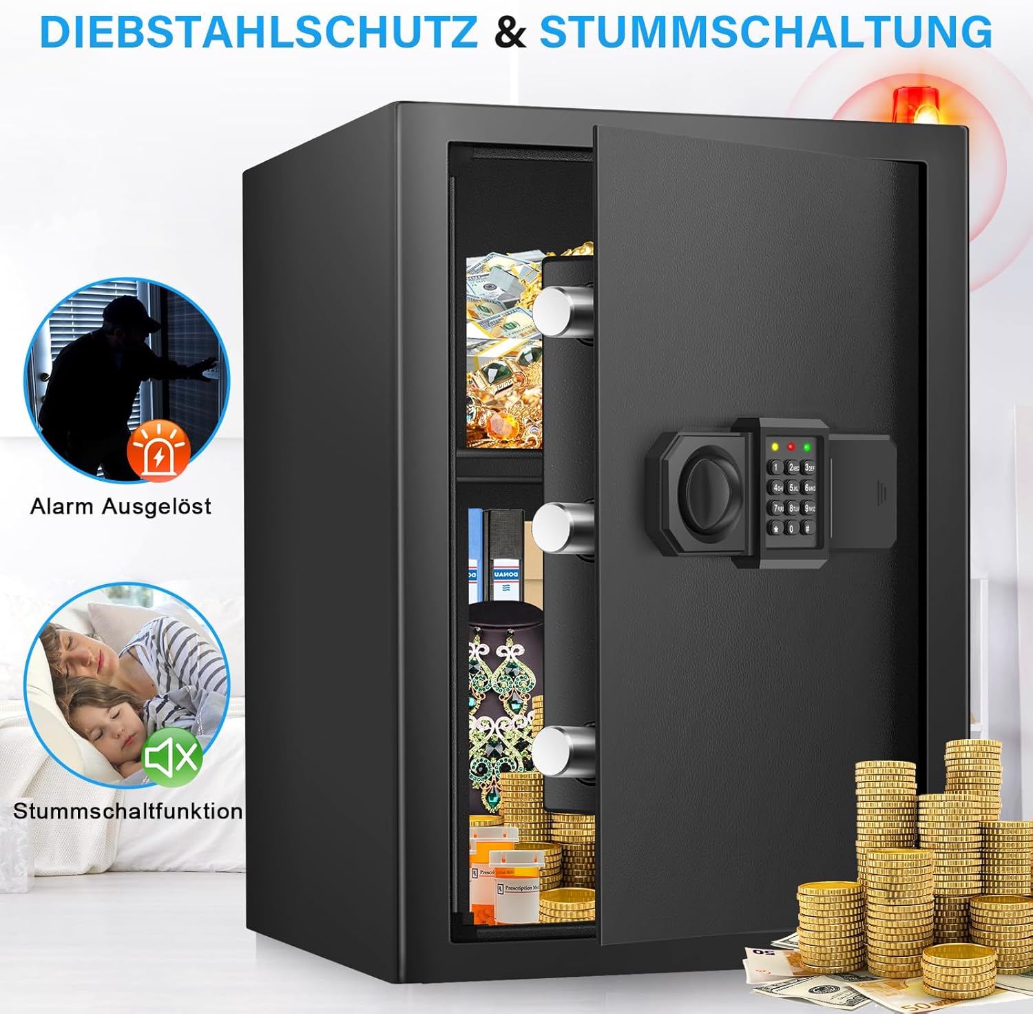 Seifs ar kombinēto slēdzeni un atslēgu: Mūsu seifam ir 3–8 ciparu parole un rezerves atslēga, kas ļauj ērti iestatīt pielāgotas paroles seifa atvēršanai ikdienas lietošanā. Tastatūra reaģē ātri un ir apgaismota, tāpēc to ir viegli lietot pat vājā apgaismojumā. Ja aizmirstat paroli, varat arī izmantot rezerves atslēgu, lai atvērtu seifu un atiestatītu paroli.