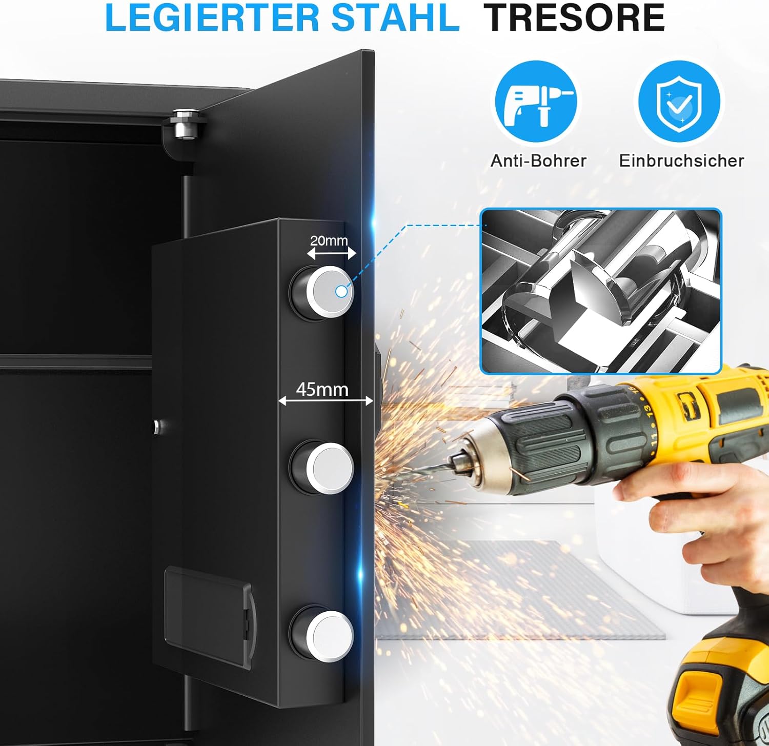 Droša seifa uzstādīšana: Seifa uzstādīšana ir vienkārša. Iepakojumā ir iekļauti iepriekš urbti uzstādīšanas caurumi un stiprinājumi, lai seifu varētu viegli piestiprināt pie skapjiem vai sienas. Šī funkcija nodrošina papildu aizsardzību pret zādzībām un neļauj zagļiem to vienkārši aiznest.