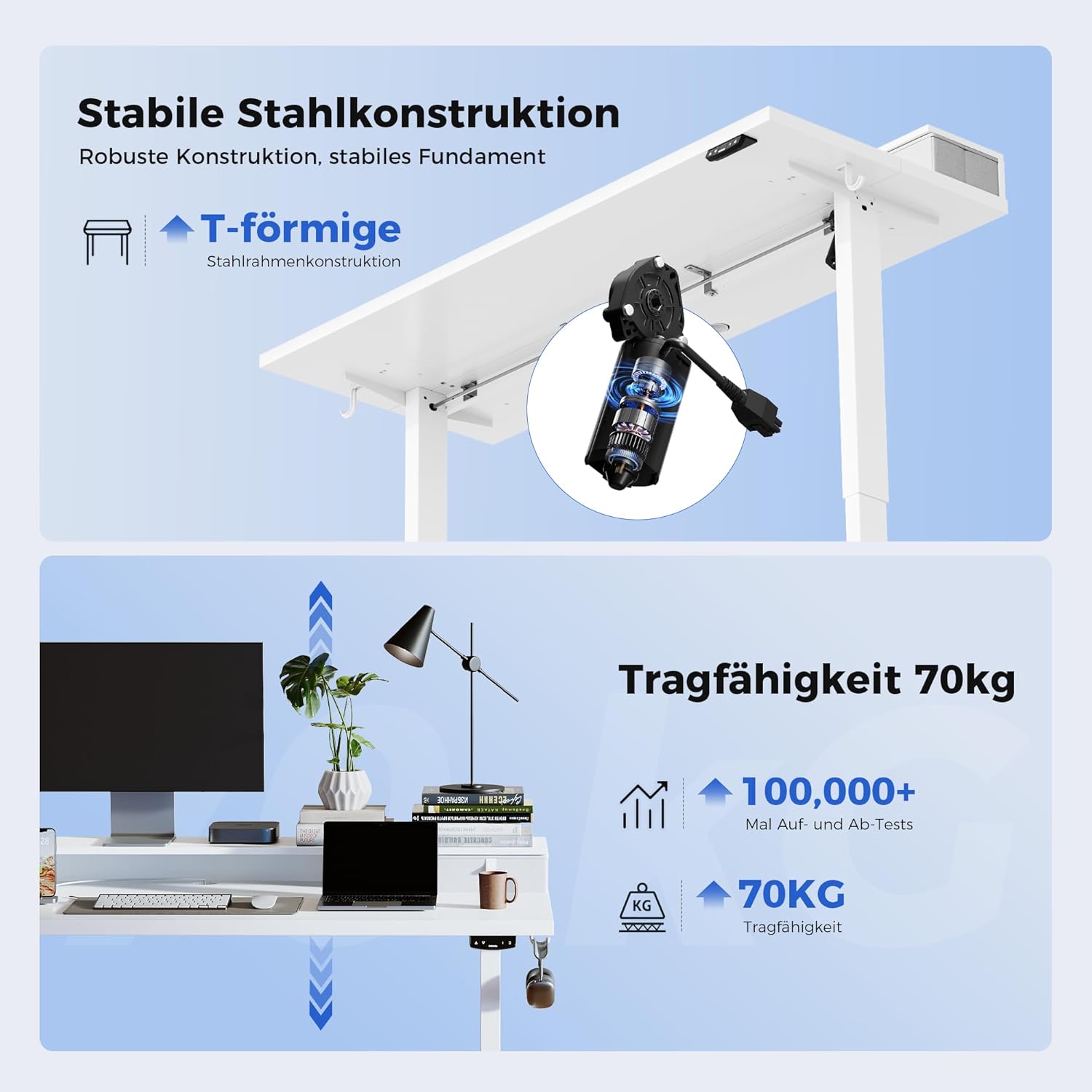 Izturīgs rāmis un izturīgs motors: Mūsu rūpnieciskās kvalitātes tērauda rāmis un T-veida rāmja konstrukcija nodrošina, ka šis sēdus-stāvus galds iztur maksimālo svaru 70 kg. Kopā ar motoru, kas ir izturējis 50 000 starptautiskus celšanas testus, ir garantēts, ka galds darbosies uzticami ilgā laika periodā.