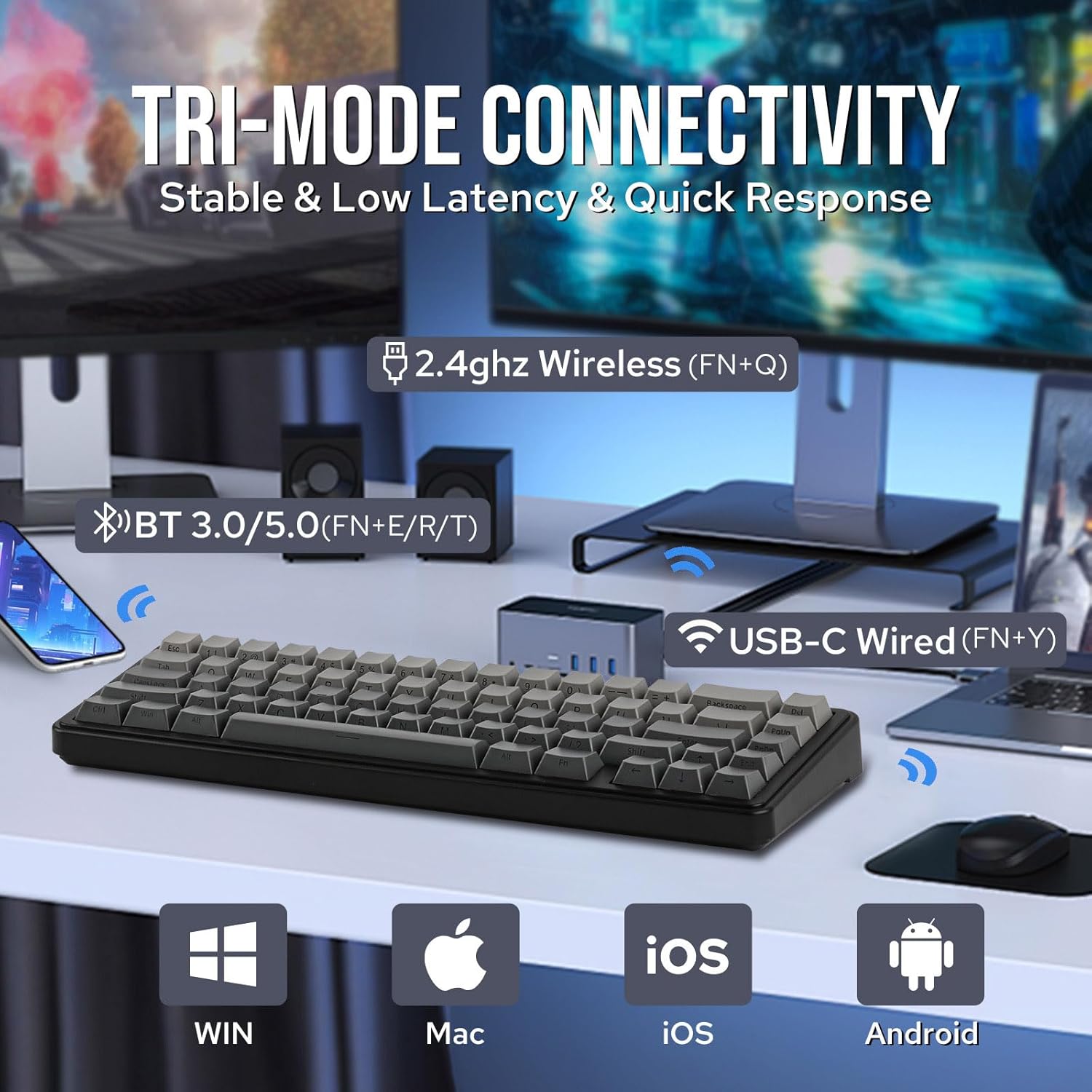 Izturīgs savienojums: Pielāgojams jebkuram scenārijam, izmantojot Bluetooth, 2.4G bezvadu savienojumu un USB-C režīmu. Liela 4000mAh baterija nodrošina, ka F65 vienmēr ir gatavs lietošanai, kad sākat spēlēt.