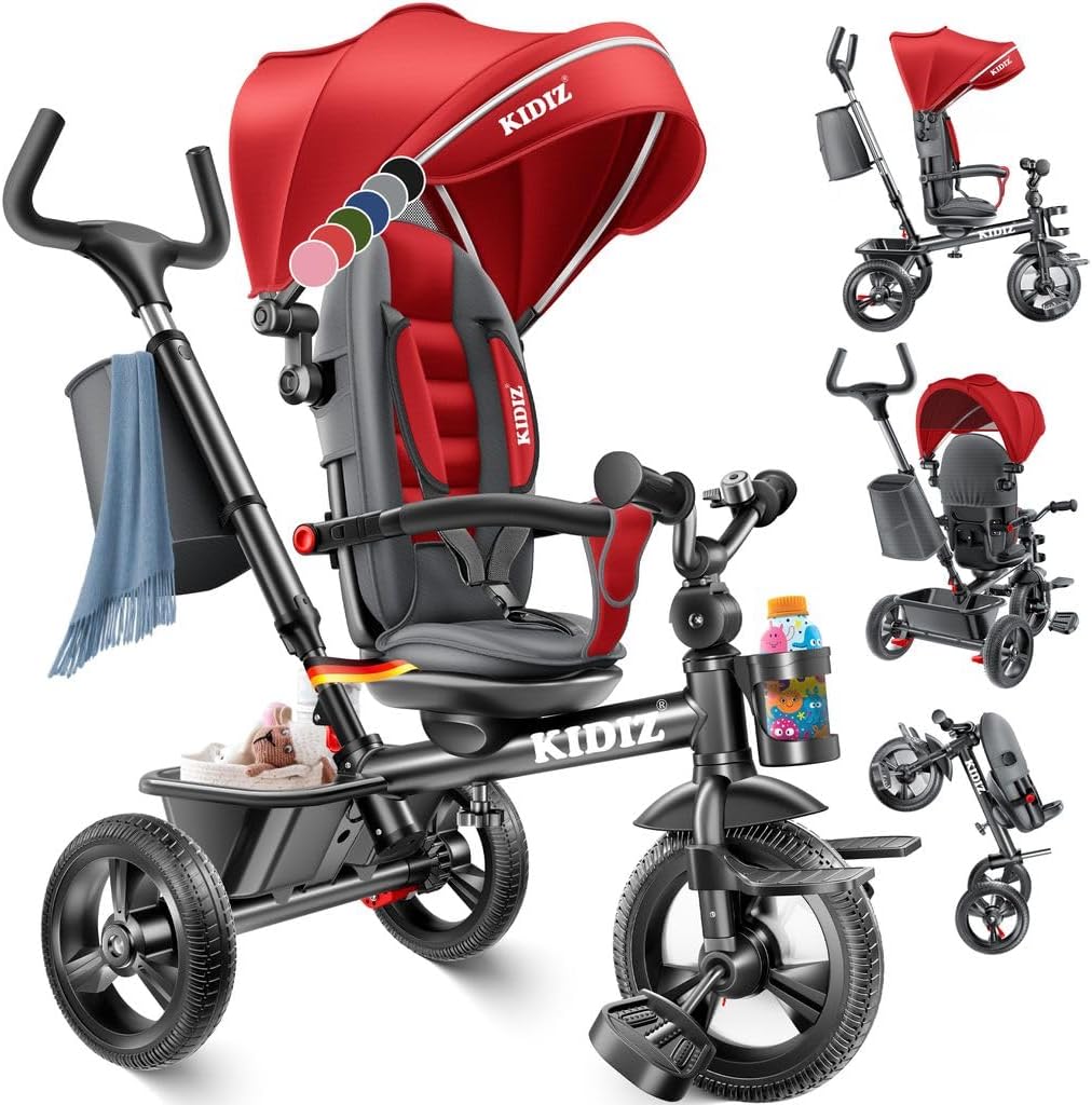 KIDIZ® Tricycle 5-in-1 bērnu trīsritenis ar stumšanas stieni, stūres sistēma, stienis no 1 gada vecuma, braukšanai uz priekšu un atpakaļ, skriešanai, grozam, somai, dzērienu turētājam, saules aizsargam, gumijas riteņiem, ratiņiem, velosipēdam, salokāmam