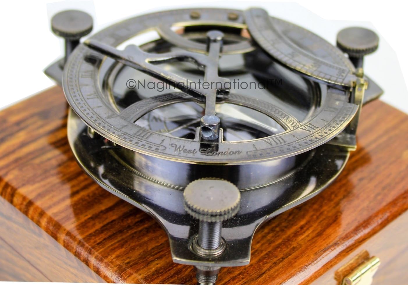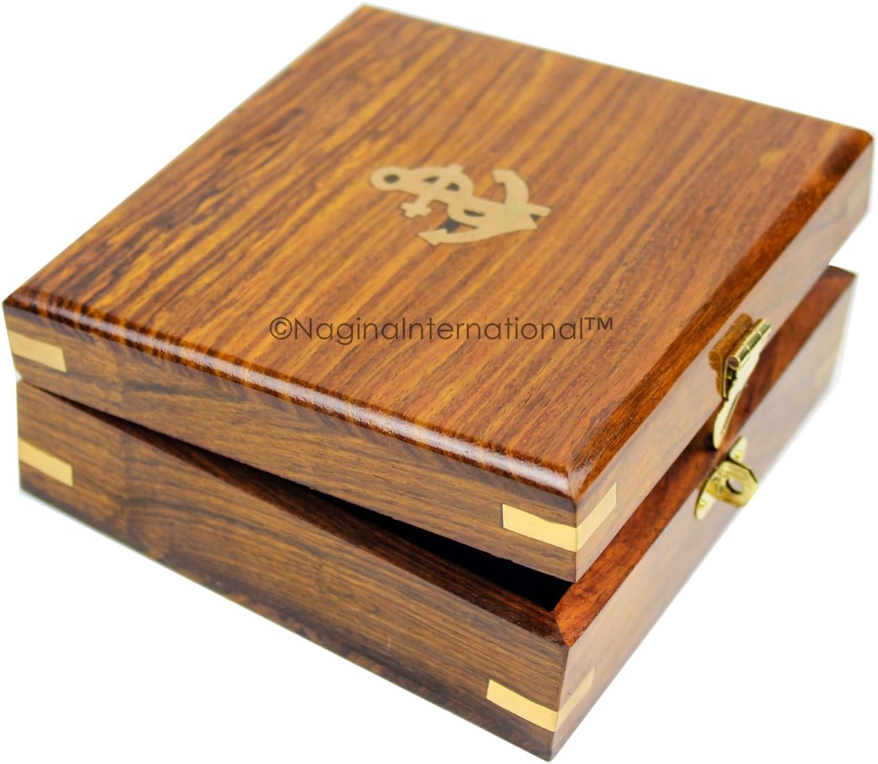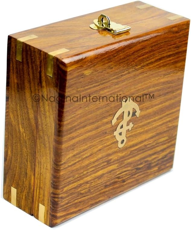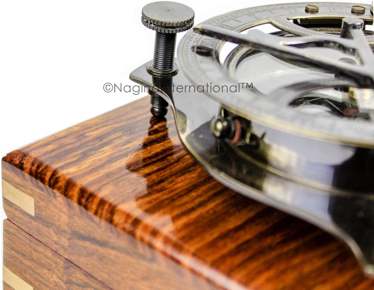 Nagina International 5" trīsstūrveida skaists jūras saules pulkstenis, kompass ar līmeņa mērītāju, kas ievietots īstā rožkoka enkura inkrustētā korpusā | Jūras dekoru dāvanas (antīks misiņš)
