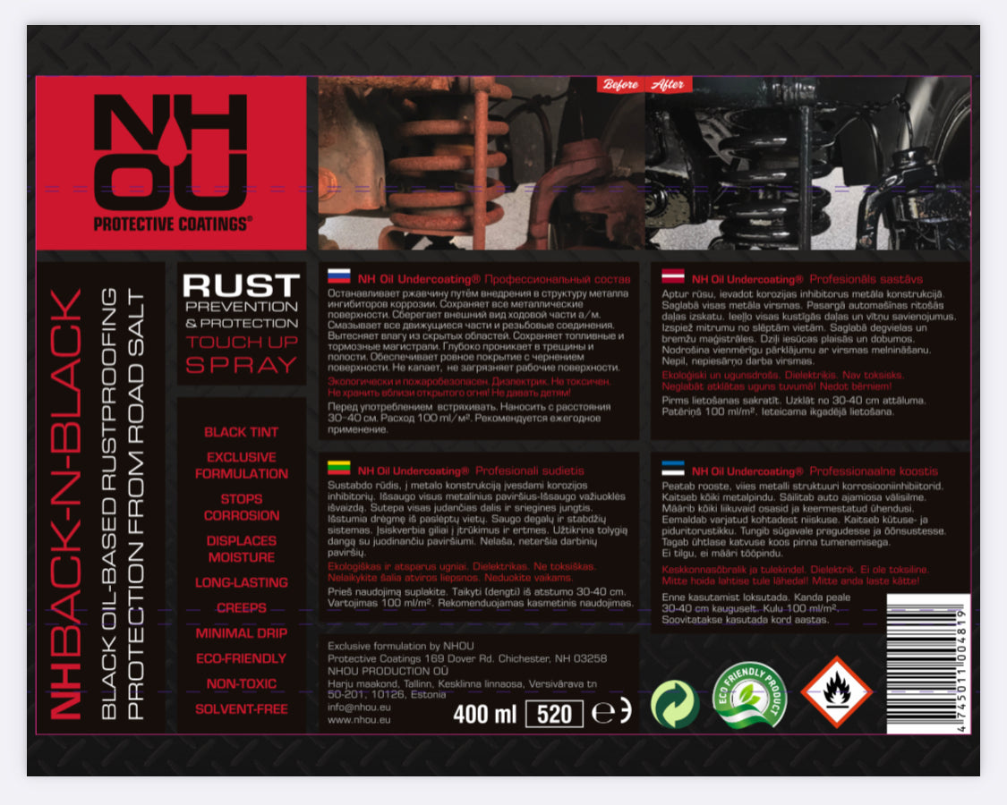NHOU Black Oil Coating ir izstrādāts, lai piedāvātu izcilu aizsardzību pret rūsu, apvienojot izcilas pretkorozijas īpašības ar estētiski pievilcīgu melnu apdari. Šis produkts ir ideāls risinājums tiem, kas vēlas efektīvi aizsargāt savu transportlīdzekli vai metāla daļas pret rūsu, vienlaikus saglabājot to tīrību un kopšanu.