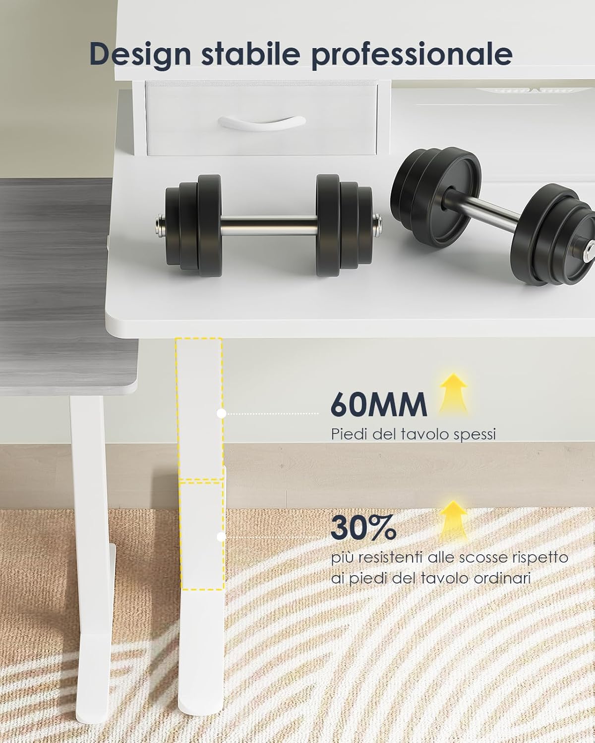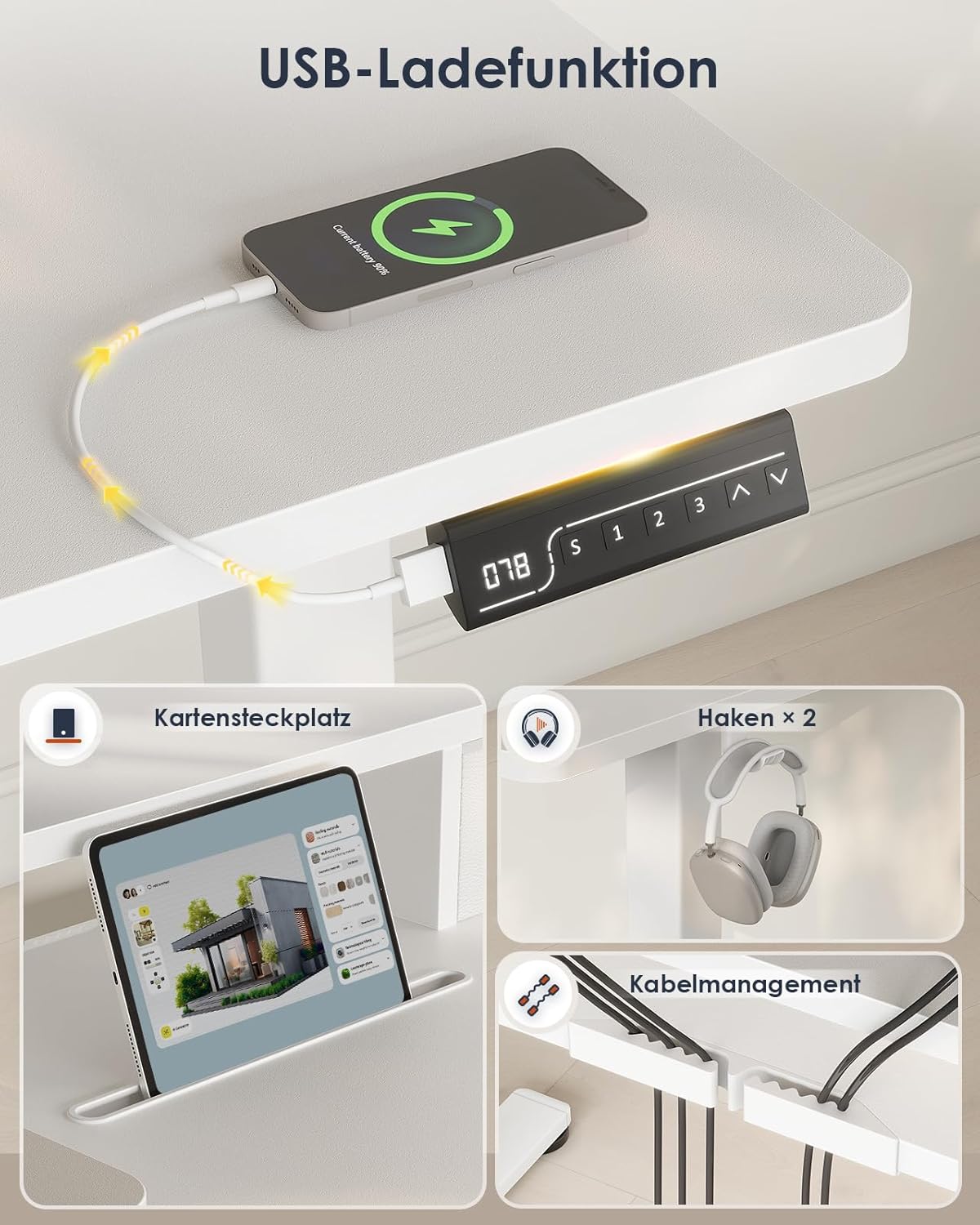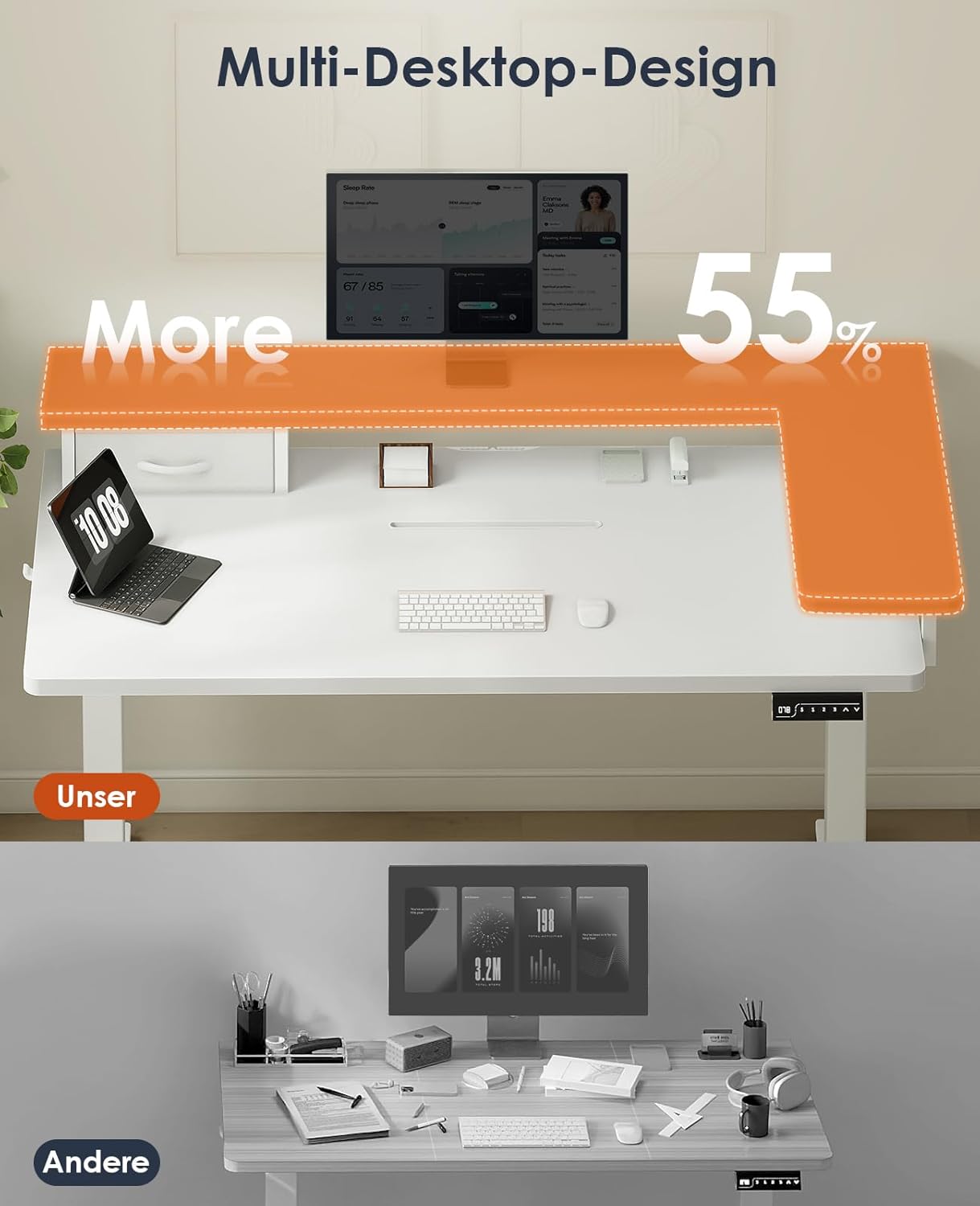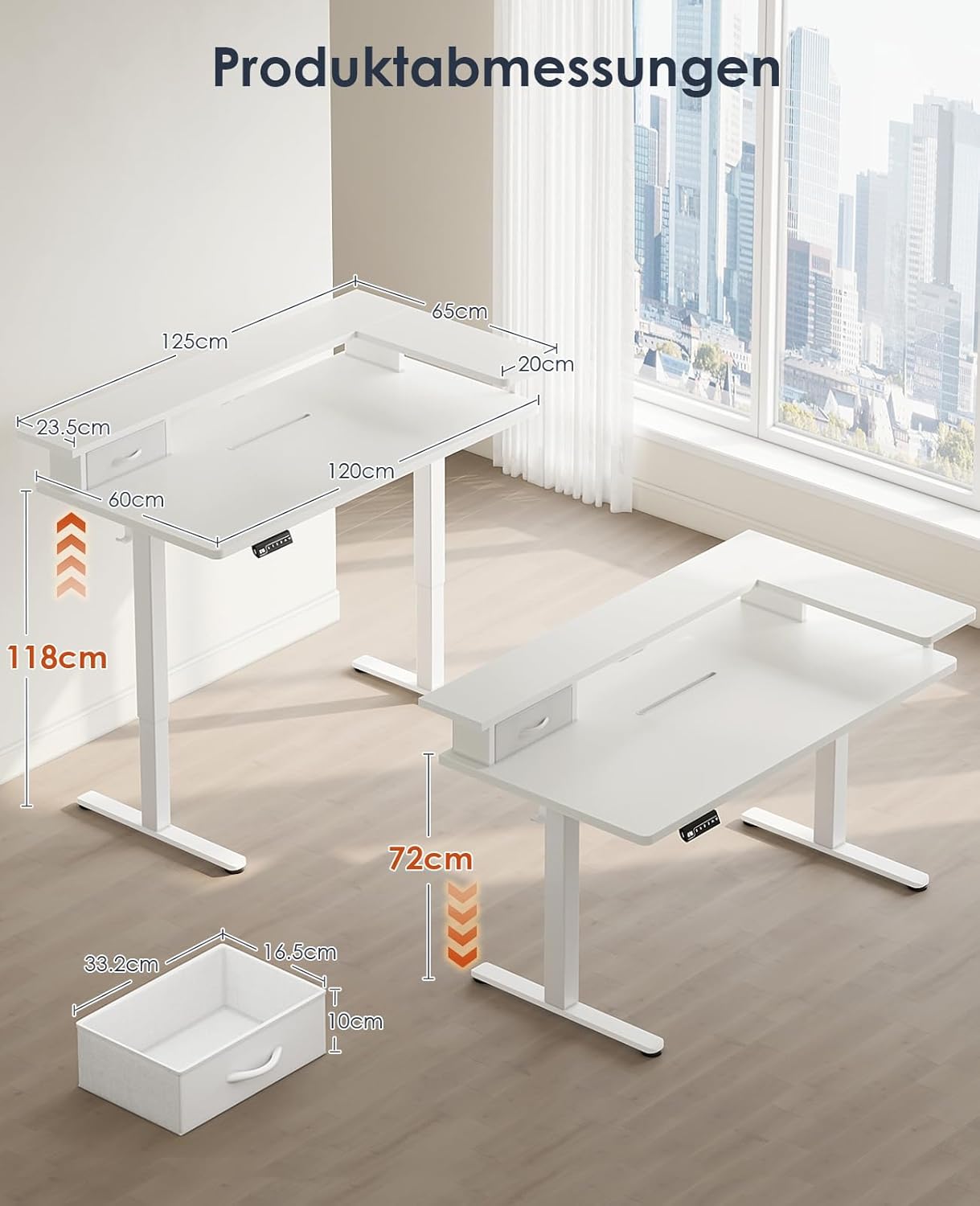 Vertikāla uzglabāšanas telpa: elektriski regulējams augstums galda līmenī ar auduma atvilktni sīkiem priekšmetiem, kas novērš jucekli uz galda un maksimāli palielina vertikālās telpas izmantošanu pārskatāmai uzglabāšanai, tādējādi izvairoties no pārpildīta galda.