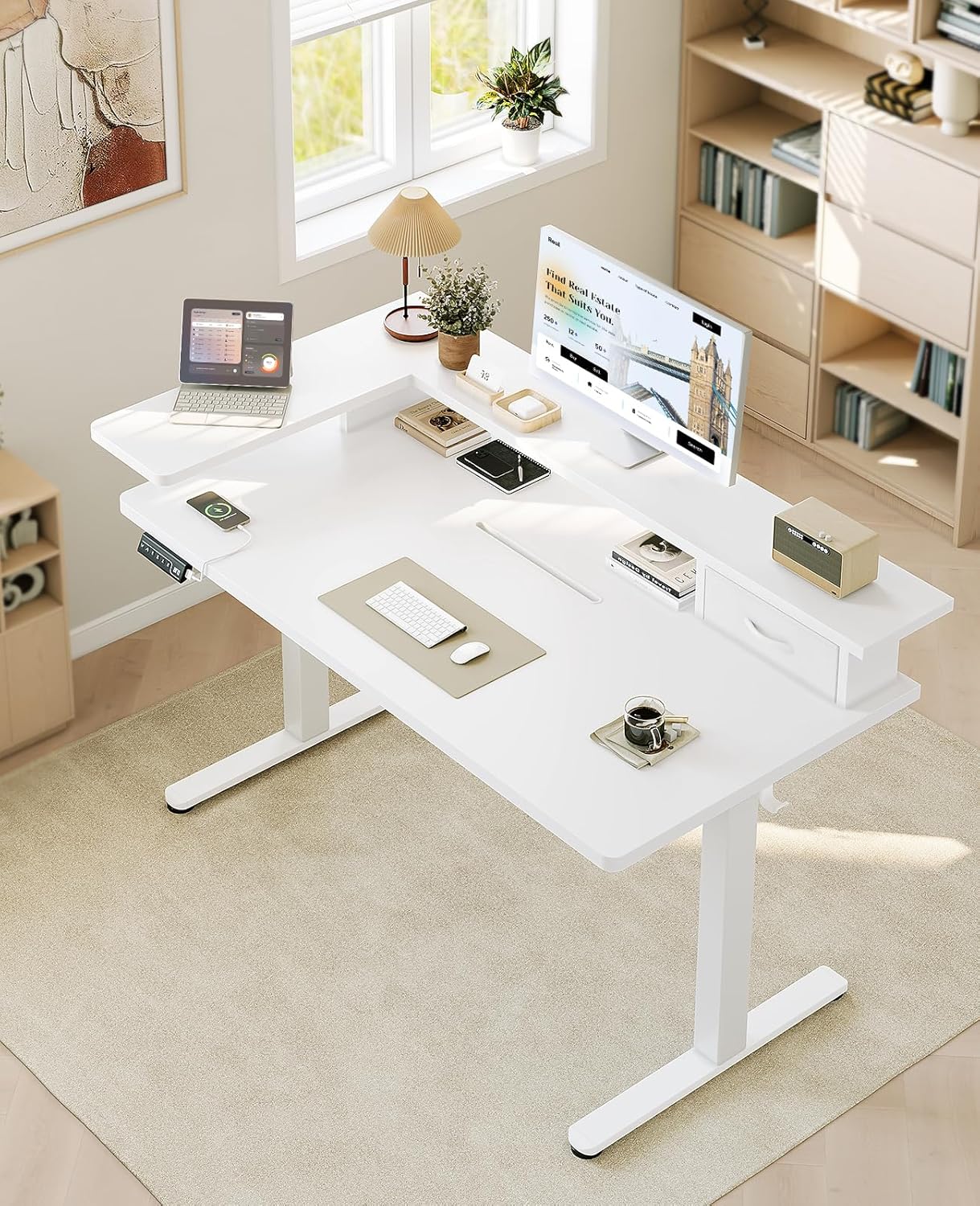 DAUDZTIKLU TELPA Divslāņu galds nodrošina par 55% vairāk uzglabāšanas vietas, savukārt L-veida kronšteins nodrošina papildu vietu monitoriem un vairāk uzglabāšanas vietas zem galda, tādējādi efektīvi mazinot spriedzi kaklā.